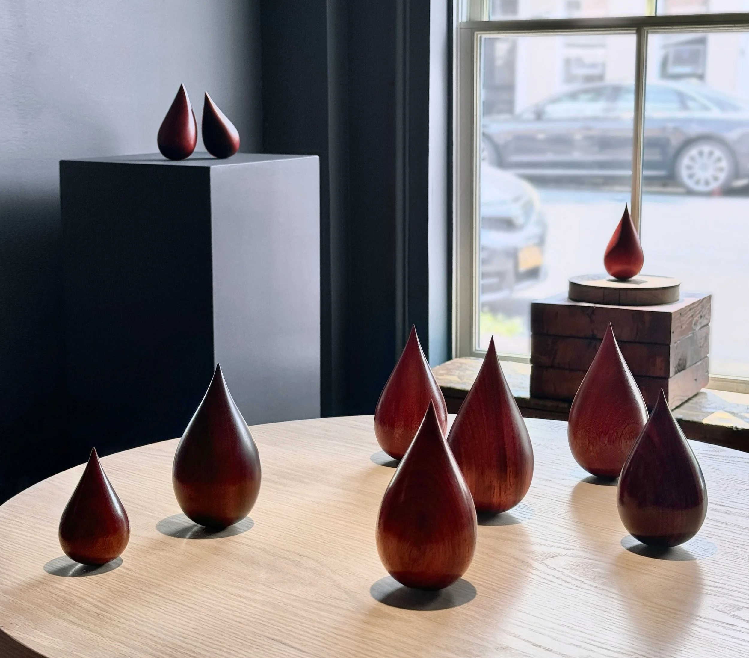 The carved “Drop” sculptures are solid wood, yet fluid in form and movement. They are self-balancing so that they can be held and moved into different relationship with each other. In order to achieve this fluidity and carefully balanced center of gravity, these sculptures are painstakingly hand made through a gradual and labor intensive process of carving, sanding, and being carved internally and filled with lead as ballast.